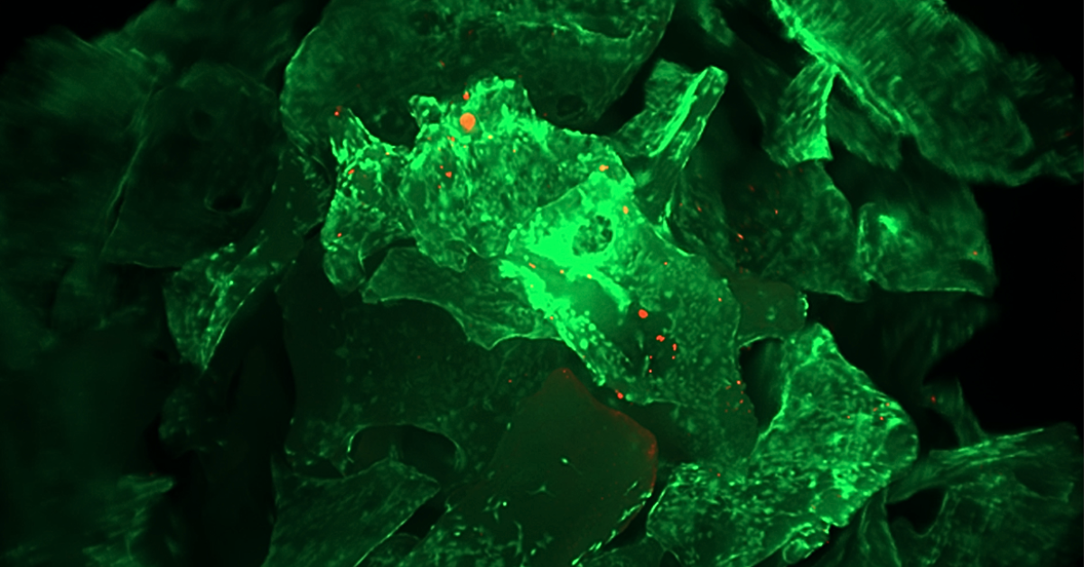 3D osteoblasts: scaffolds studied in Dr Coccoluto’s thesis with cells adhering (in green) to their surface, observed by fluorescence stereomicroscopy. Courtesy of Dr Coccoluto